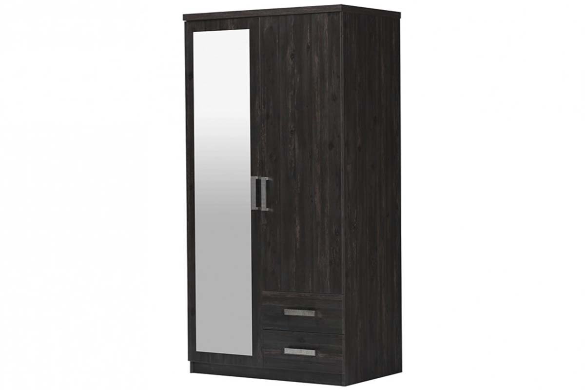 Armoire à portes coulissantes avec miroir. Le meuble est en bois et a une finition noir mat. Les portes ont des poignées en aluminium. Le meuble a un design simple et moderne.