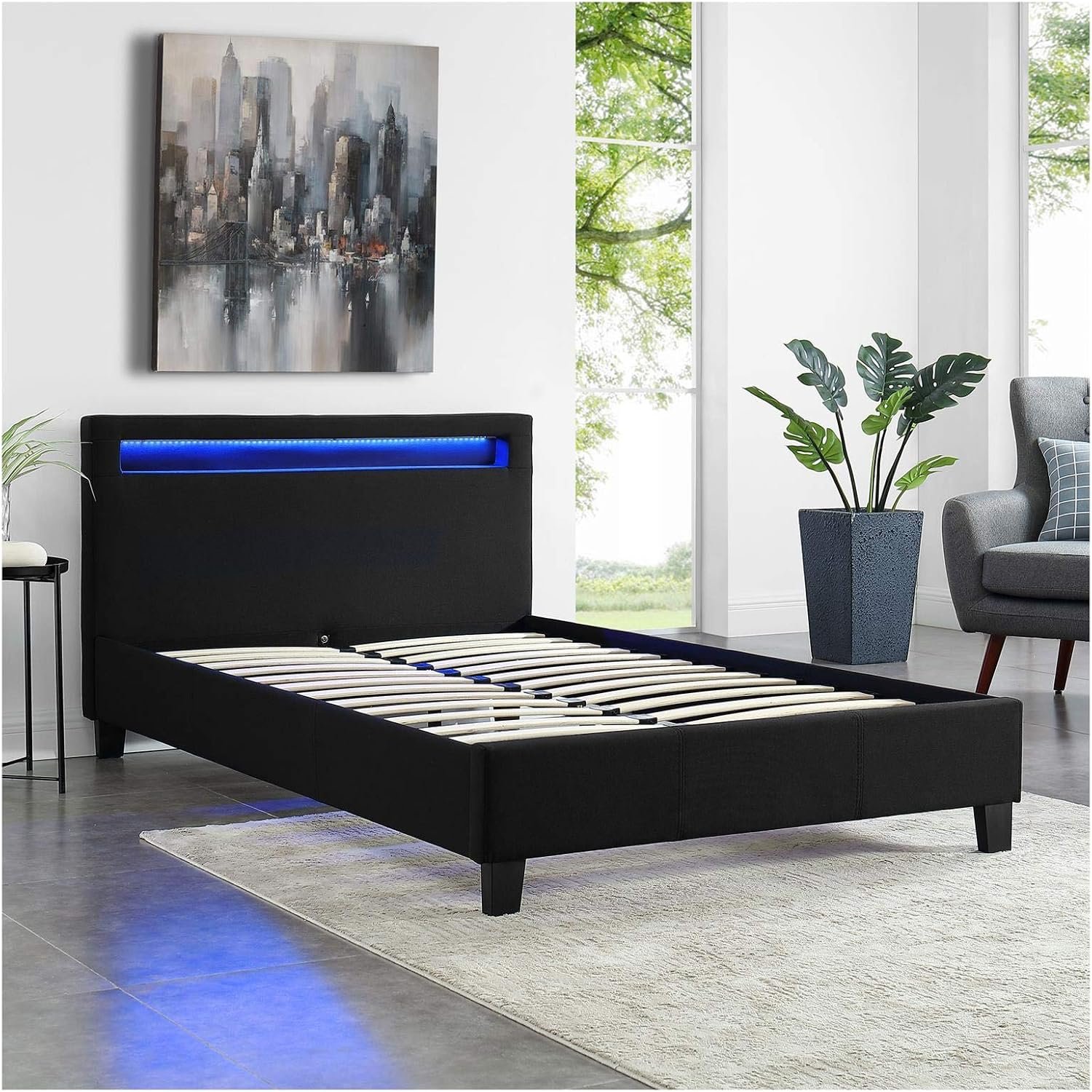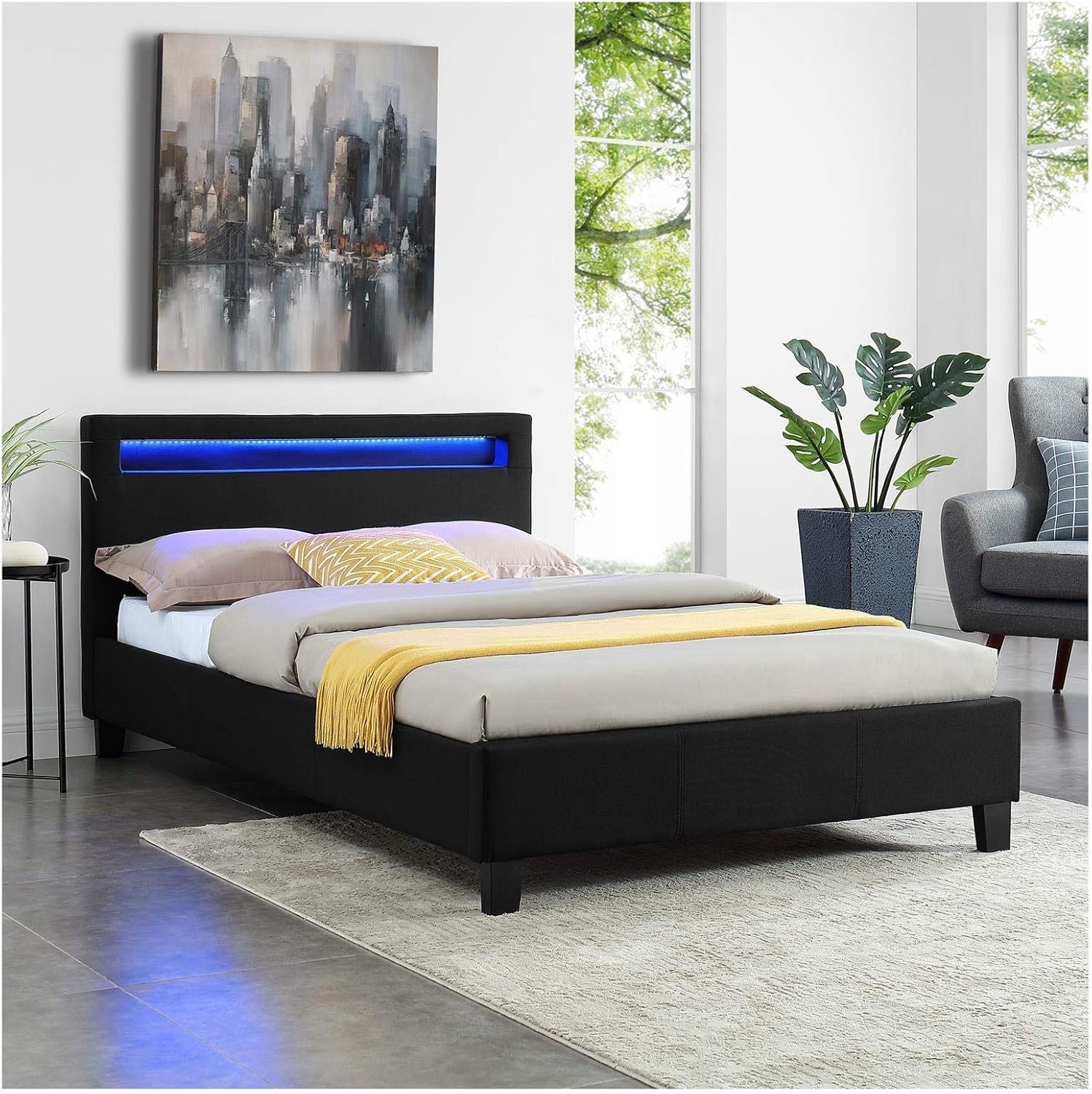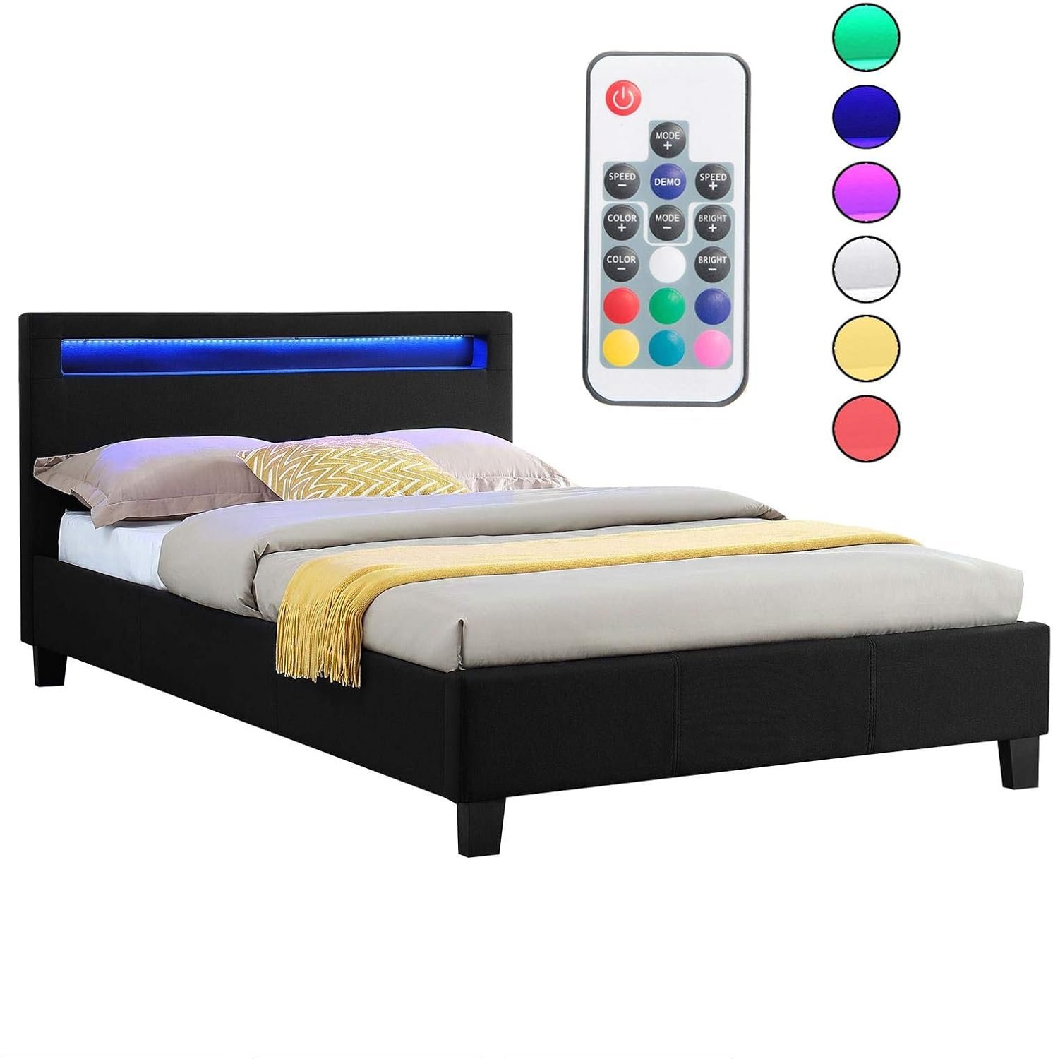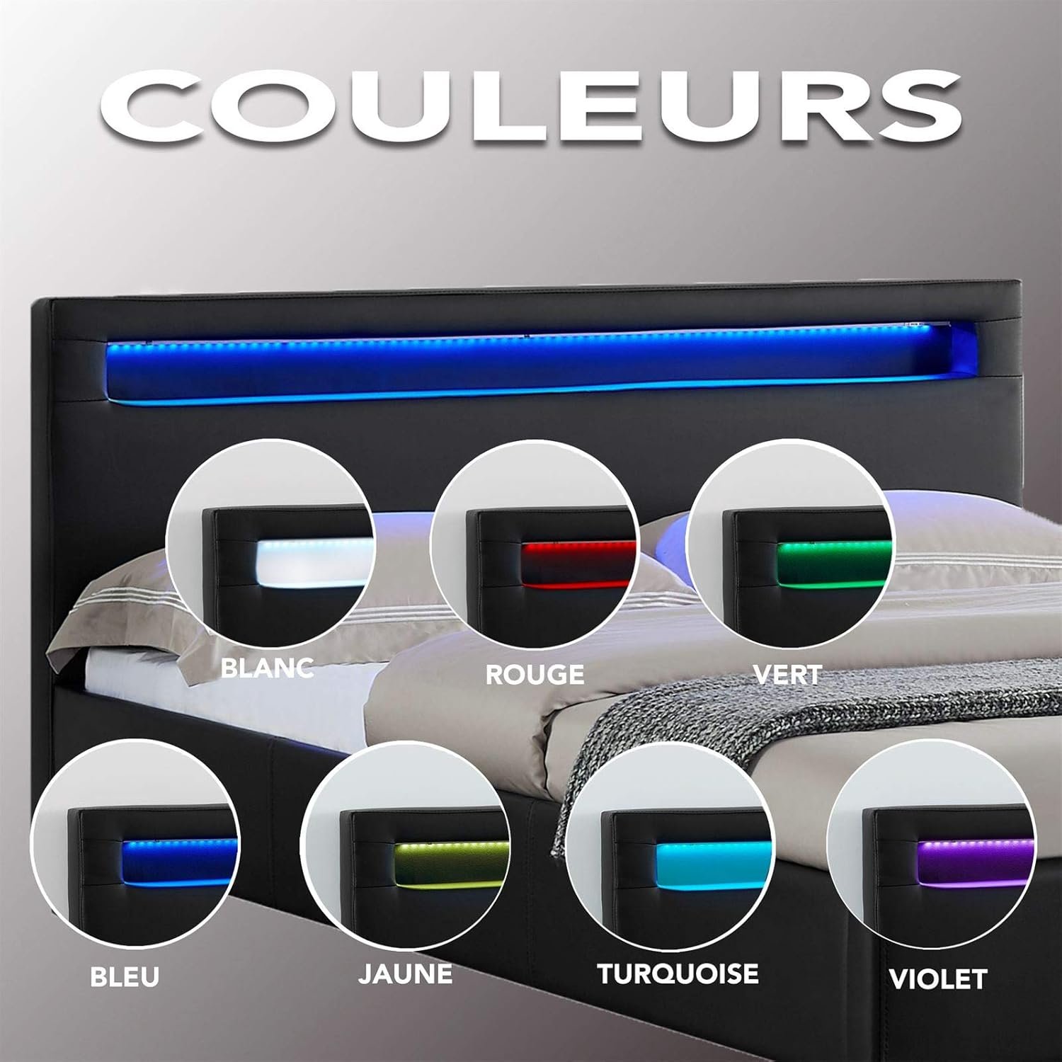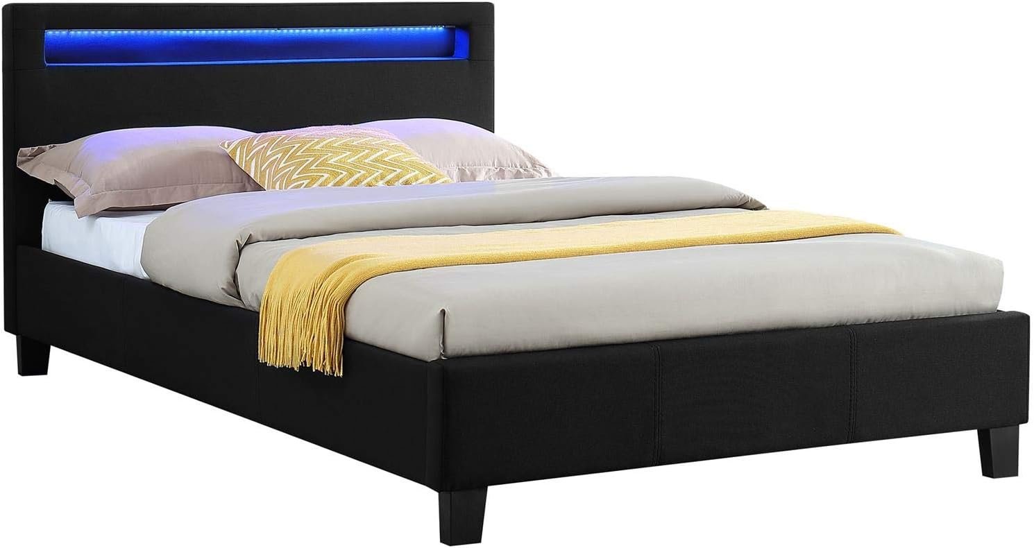Ce lit moderne apportera certainement une touche de modernité à votre chambre. Sa tête de lit rembourrée est équipée d’un éclairage LED, vous permettant de personnaliser la couleur et les effets de lumière selon vos préférences. Le design élégant du lit est également marqué par son revêtement en simili cuir. La stabilité du lit est assurée par quatre pieds robustes, une traverse centrale et deux pieds de support supplémentaires sous le sommier à lattes, inclus dans la livraison.