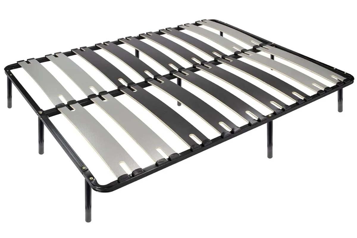 Dans l’image ci-jointe, le sommier à lattes comporte des lattes en bois robustes placées dans un cadre à sommier tapissier en métal. Chaque latte est positionnée uniformément et solidement fixée au cadre à l’aide d’embouts en plastique durable, garantissant stabilité et longévité.