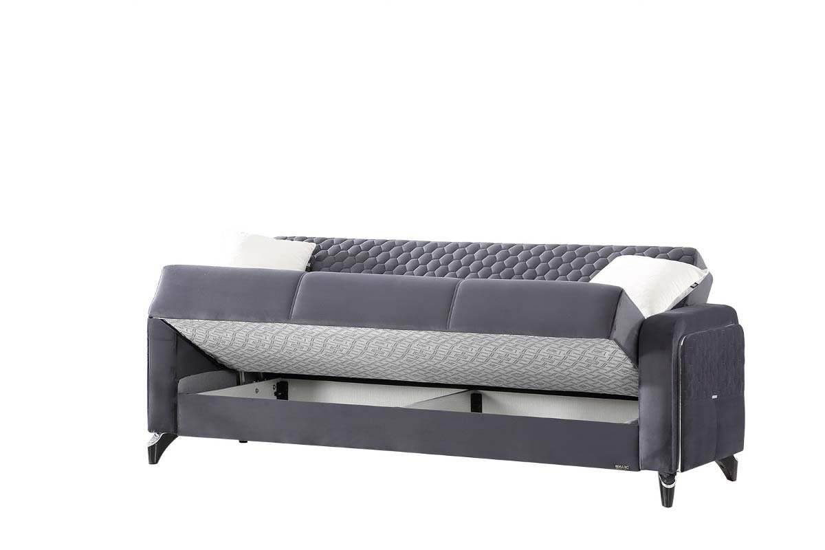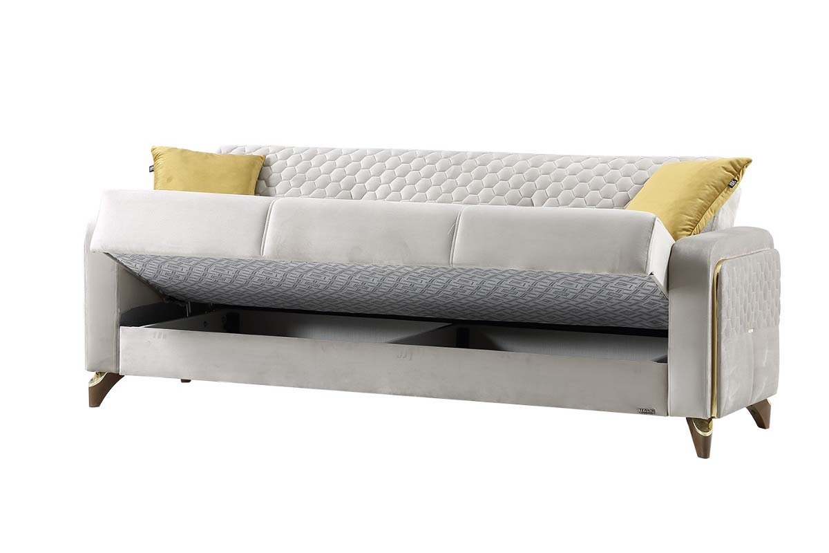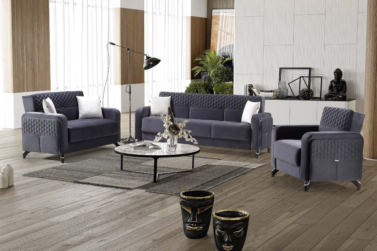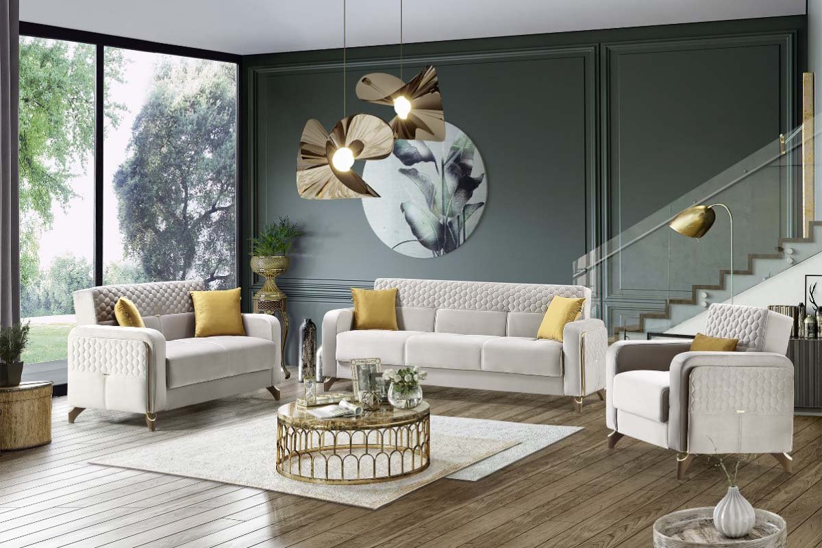 Le salon Almeria allie élégance et praticité, offrant un design multifonctionnel qui s’adapte à vos besoins. Cette pièce polyvalente se transforme sans effort d’un canapé sophistiqué en un lit confortable, idéal pour accueillir des invités pendant la nuit. Il dispose également d’un compartiment de rangement pratique, parfait pour ranger des draps, des coussins ou d’autres essentiels supplémentaires.