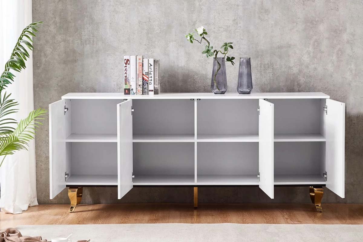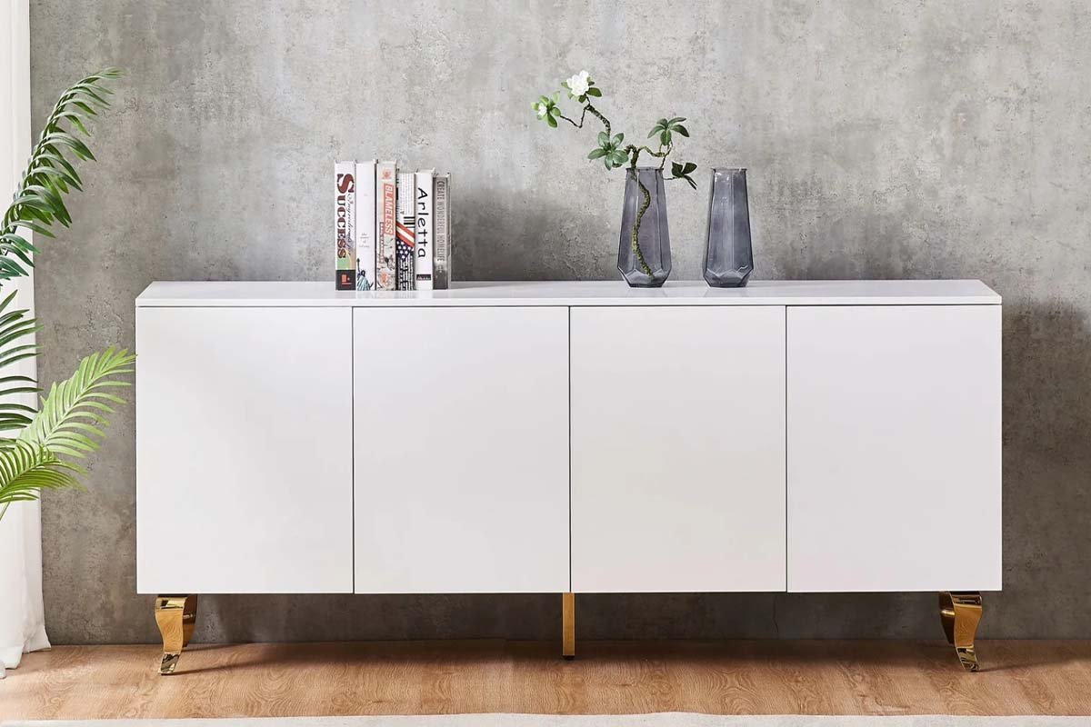 Présentation du buffet baroque 4 portes BLANC avec pieds dorés et argentés, une incarnation par excellence de la splendeur royale. Ce buffet exceptionnel allie magistralement l’opulence baroque avec des matériaux de la plus haute qualité, créant un point central de style et de substance dans n’importe quelle pièce.