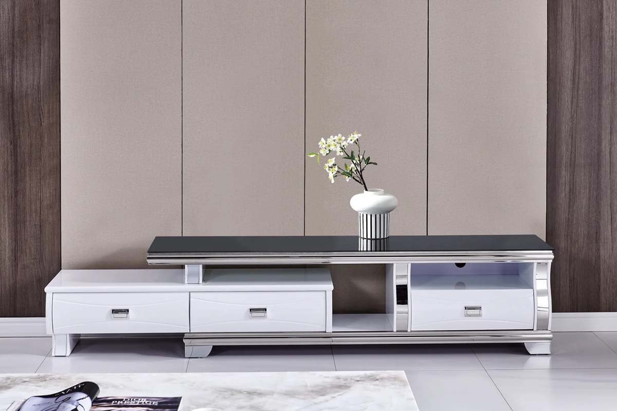 Les détails de la finition chromée rehaussent son allure avec une touche de brillance subtile, ajoutant une touche raffinée à son esthétique globale. Pratique mais visuellement frappant, le banc TV MADY sert non seulement de solution de rangement fonctionnelle pour vos essentiels multimédias, mais se distingue également comme pièce maîtresse de votre espace de divertissement.